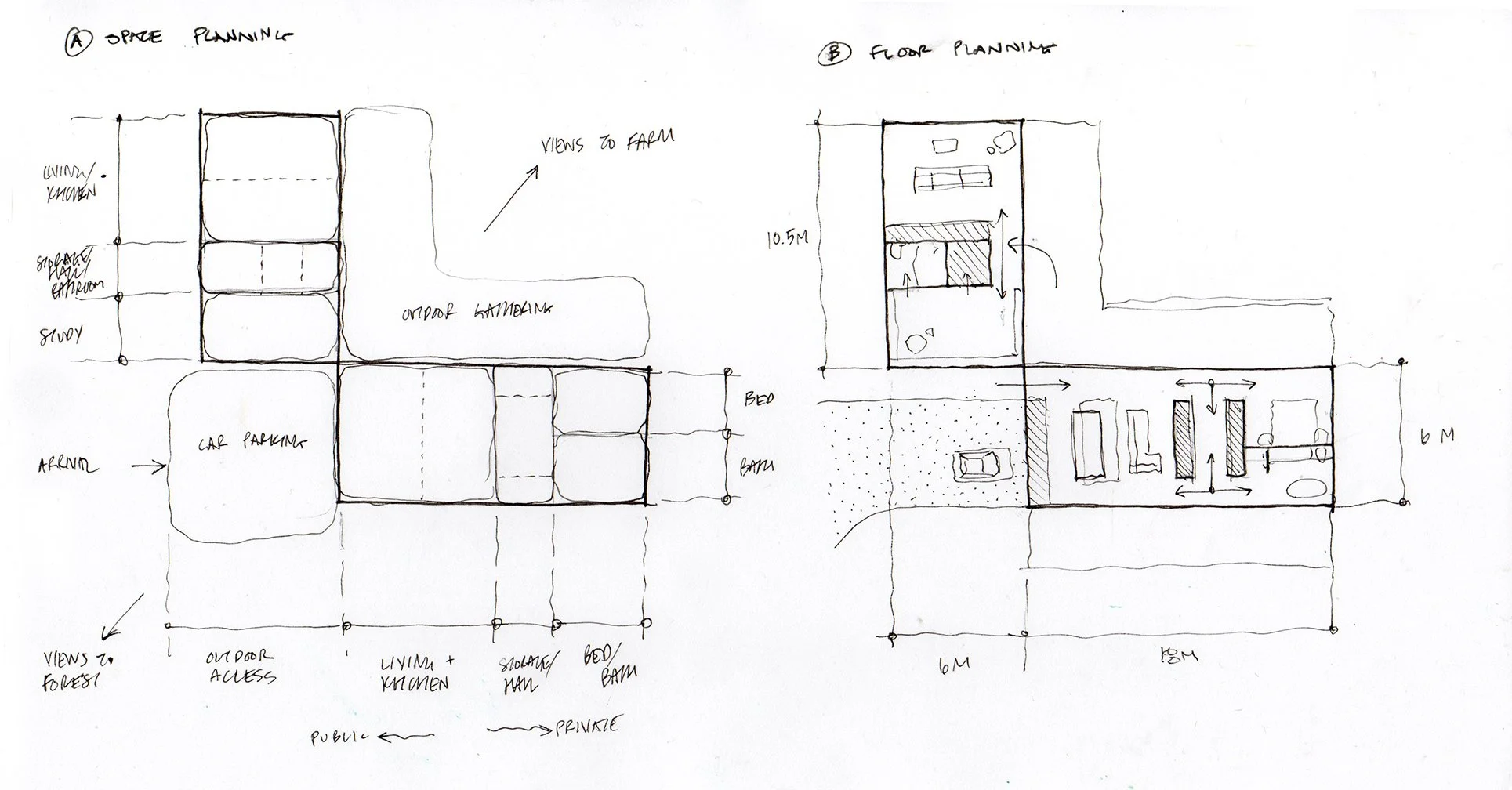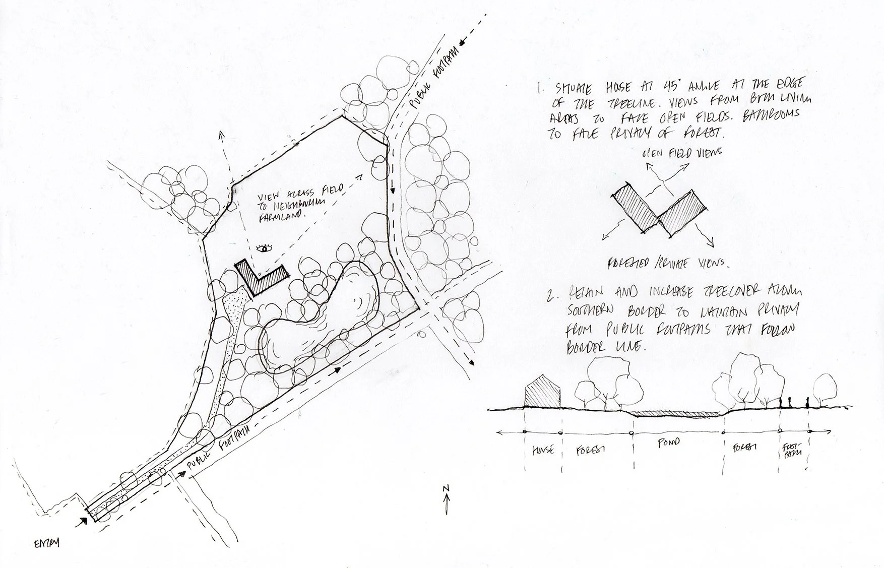 1.Entry gate and access road 2.Parking with Permeable paving 3.Home 4.Undeveloped lang 5.Pond 6.Public Footpath 7.Neighbouring farm